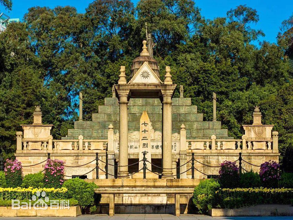 黄花岗七十二烈士墓(Huanghuagang Seventy Two Martyrs Cemetery),位于广东省广州市越秀区先烈中路79号黄花岗公园内,是为纪念清宣统三年(1911年)4月27日(农历辛亥三月二十九日)孙中山先生领导的同盟会在广州“三•二九”起义战役中牺牲的烈士而建的墓冢。始建于民国元年(1912年),占地面积160000平方米。黄花岗七十二烈士墓初建时,仅有七十二烈士墓冢一处,故得此名。民国二十一年(1932年),又查出烈士十四名,至此收殓有姓名、事迹可考的烈士86名,后几经拓建,方形成现有规模。黄花岗七十二烈士墓是墓园的核心,由七十二烈士墓冢及其附属的大牌坊、主墓道、默池、纪功坊、蓄水池、奏乐台等建筑组成。黄花岗七十二烈士墓是广州作为近代革命策源地的重要见证。1961年,黄花岗七十二烈士墓被中华人民共和国国务院公布为第一批全国重点文物保护单位。