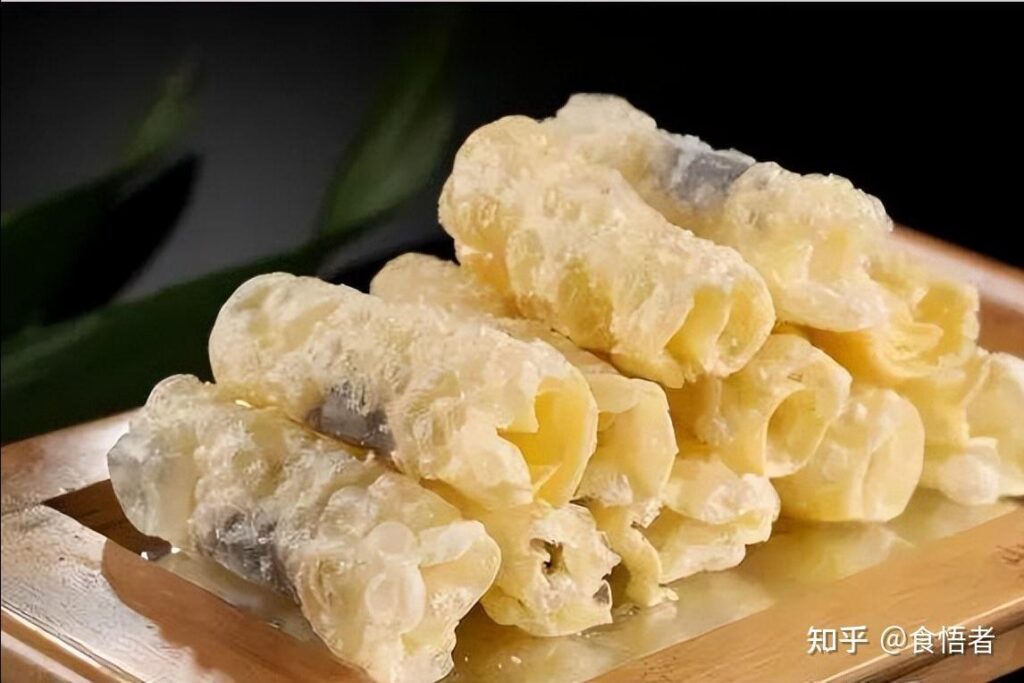 夹沙乳扇是云南大理白族传统特色菜品,以乳扇包裹桃仁、洗沙等馅料经油炸制成,最早可追溯至明代大理地区的乳制品加工传统。乳扇选用洱源当地鲜牛奶经酸浆凝结、手工拉伸成扇形薄片晾干制作,形成含水量低、便于储存的特型干酪。制作时需将乳扇回软摊平,填充豆沙混合桃仁碎、玫瑰糖及火腿末的夹沙馅,卷筒后低温油炸至金黄,成品外酥内软兼具奶香与坚果香气。该菜品作为「云南十八怪」中「牛奶做成扇子卖」的典型代表,在大理地区婚宴节庆中具有重要饮食文化象征