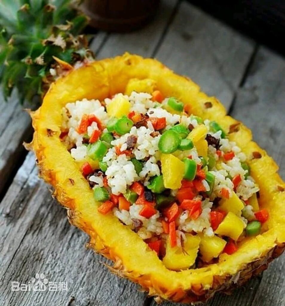 菠萝饭,又叫凤梨饭,是以菠萝、米饭等食材制成的一道美食。菠萝内含维生素A、B、C,钙、磷、钾等矿物质,脂肪,蛋白质等。其中有一种叫“菠萝脘酶”的物质能分解蛋白质,溶解阻塞于组织中的纤维蛋白和血凝块。同时菠萝中所含的糖、盐类和酶有利尿作用,所以肾炎和高血压病患者宜食用。
