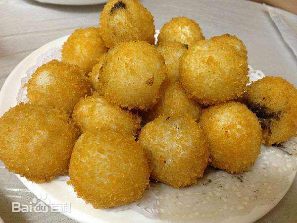 吴家油炸汤圆是一种美味可口的汉族小吃。把白糖、糖桂花和熟猪油放入碗中,拌匀,并用力砸压成厚块,然后切成1厘米见方的小块。将切好的小块糖馅蘸水后,放入糯米中滚成直径为2~3厘米的汤圆(如不够个,可再蘸水滚动)。锅内加花生油置于旺火上烧至八成熟,倒入汤圆油炸(炸时应用勺轻几下汤圆,以防崩破),待炸至汤圆浮在油面上,并呈金黄色时即可捞出。