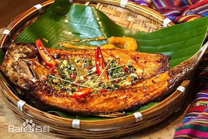 香茅草烤鱼是以新鲜罗非鱼为主料,配以香茅草及傣味经典调料制作的炭火烤制菜肴。制作过程包含双次腌制工序,初次用料酒、姜片等祛腥,复腌时加入蚝油、生抽等调味,鱼腹填充姜蒜末、小米辣等香料后用香茅草捆扎烤制,形成外酥里嫩、兼具炭火香与香草清香的独特风味。该菜肴在云南金平泼水节期间作为傣族特色美食进行推广,2025年相关报道显示其主材选用范围扩展至500-1000克的罗非鱼或鲫鱼
