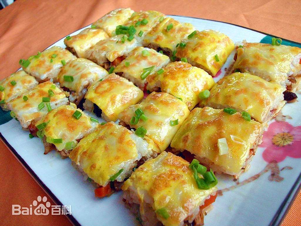 三鲜豆皮是湖北省武汉市的一道著名小吃,也是武汉人早点(武汉人称“过早”)的主要食品之一;三鲜豆皮是由糯米和豆皮等食材制作而成,以馅中有鲜肉、鲜蛋、鲜菇(鲜笋)、豆干而得名。最初是武汉人逢年过节时特制的节日佳肴,后来成为寻常早点。色泽金黄透亮,鲜艳夺目,皮薄软润爽口,滋味鲜美,含有蛋、菇、肉香。以其独特风味远近闻名。豆皮制作过程中要求“皮薄、浆清、火功正”,这样煎出的豆皮外脆内软、油而不腻。