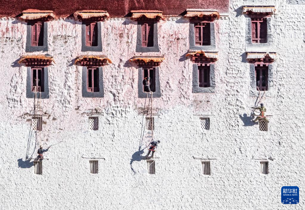 近日,西藏布达拉宫迎来一年一度的粉刷“美容”。工作人员和志愿者将粉刷材料按比例混合,经过滤后对布达拉宫墙体进行喷涂,让建筑更加美观